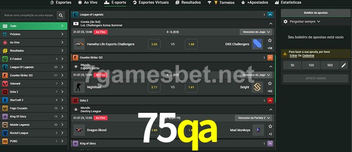 O 75qa oferece uma grande seleção de opções de apostas em e-sports com probabilidades competitivas